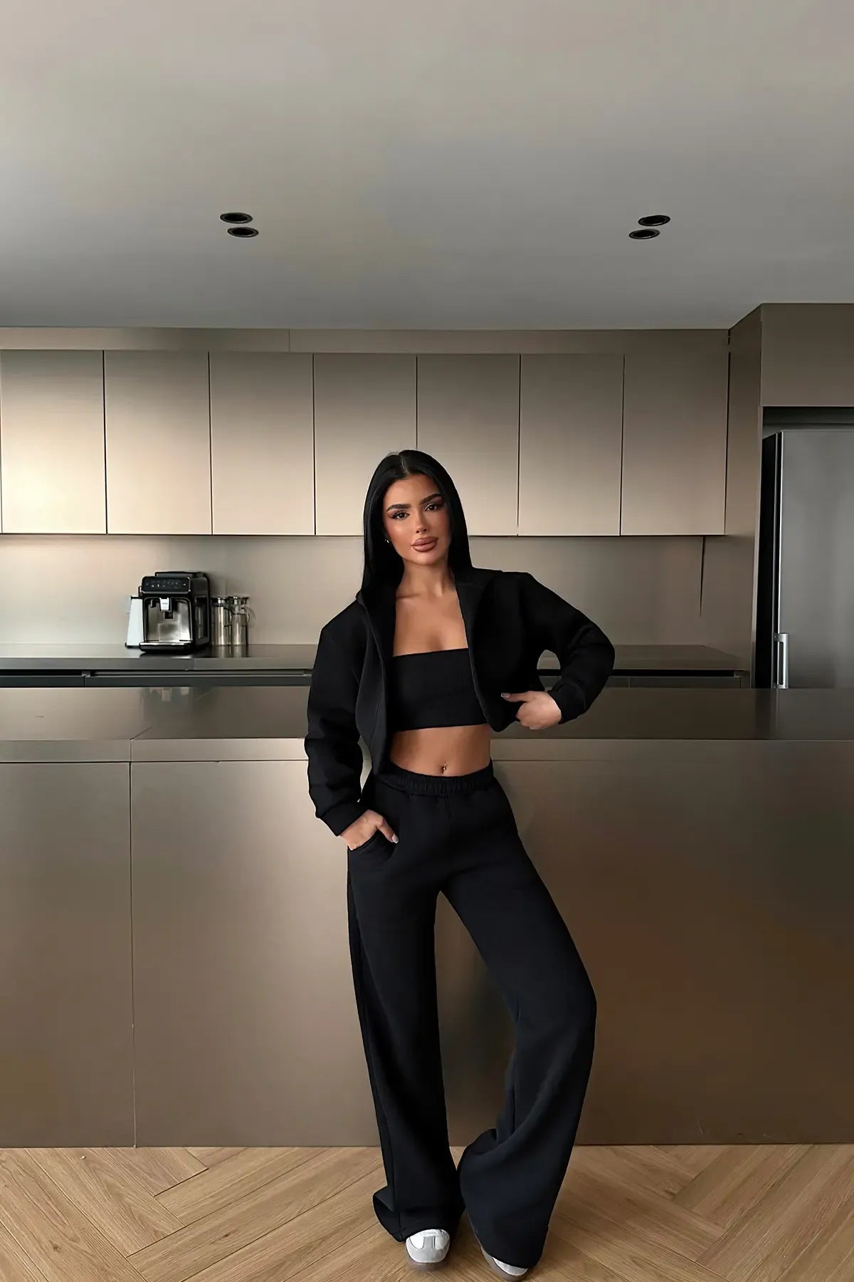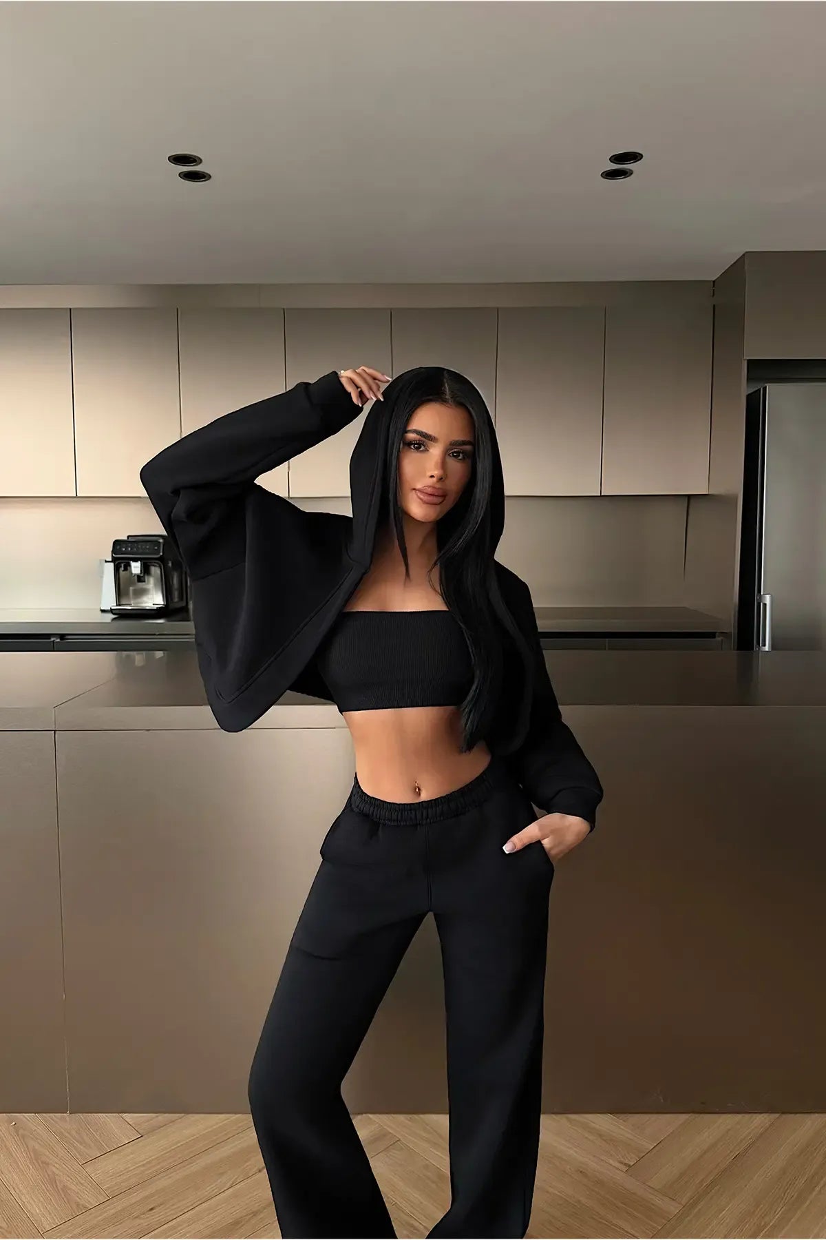 Das dreiteilige Design mit figurbetontem Bandeau-Top, lässiger Wide-Leg Hose und cropped Hoodie schafft einen stilvollen, selbstbewussten Look.
